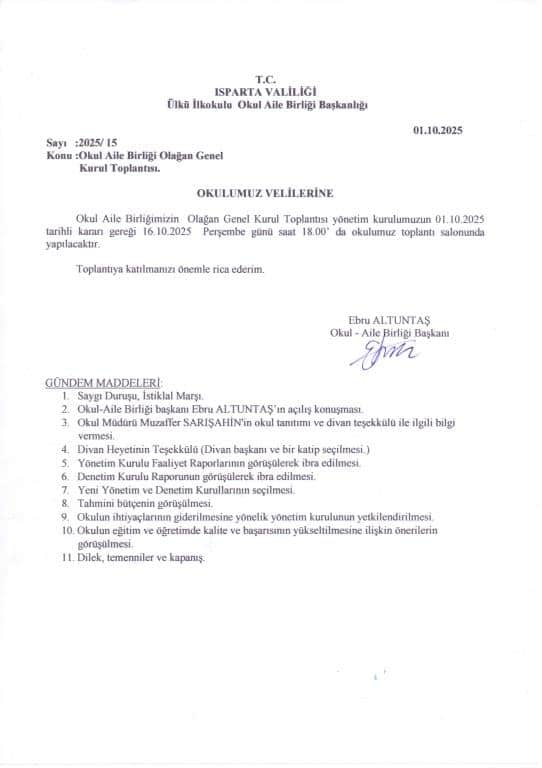 Okul Aile Birliğimizin Genel Kurul Toplantısı, Yönetim Kurulumuzun 01.10.2025 tarihli kararı gereği 16.10.2025 tarihinde Perşembe günü saat 18:00'de okulumuz toplantı salonunda yapılacaktır. Toplantıda belirteceğiniz görüş ve öneriler okulumuzun vereceği eğitim ve öğretime katkı sağlayacaktır.